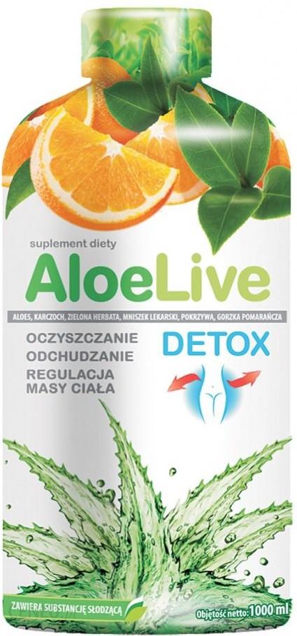 AloeLive Detox to suplement diety, którego składniki roślinne wspomagają oczyszczanie organizmu z toksyn i zbędnych produktów przemiany materii, wpływają korzystnie na prawidłową pracę układu pokarmowego, wątroby i nerek oraz wspomagają odchudzanie.Aktywne składniki AloeLive Detox to aż 6 substancji działających kompleksowo i uzupełniających się wzajemnie.Sok z aloesu wpływa korzystnie na pracę układu żołądkowo-jelitowego i wspomaga trawienie.Wyciąg z karczocha wspomaga prawidłową pracę wątroby oraz funkcję wydalniczą nerek dzięki czemu pomaga w naturalnym oczyszczaniu organizmu z toksyn i zbędnych produktów przemiany materii.Wyciągi z zielonej herbaty i pokrzywy wspomagają usuwanie nadmiaru wody z organizmu. Dodatkowo wyciąg z zielonej herbaty wspomaga prawidłowy metabolizm tłuszczów co jest pomocne w regulacji masy ciała.Wyciąg z mniszka lekarskiego wspomaga pracę wątroby i układu trawiennego oraz wpływa korzystnie na prawidłowe funkcjonowanie układu moczowego.Wyciąg z gorzkiej pomarańczy poprzez korzystny wpływ na metabolizm kwasów tłuszczowych wspomaga odchudzanie.