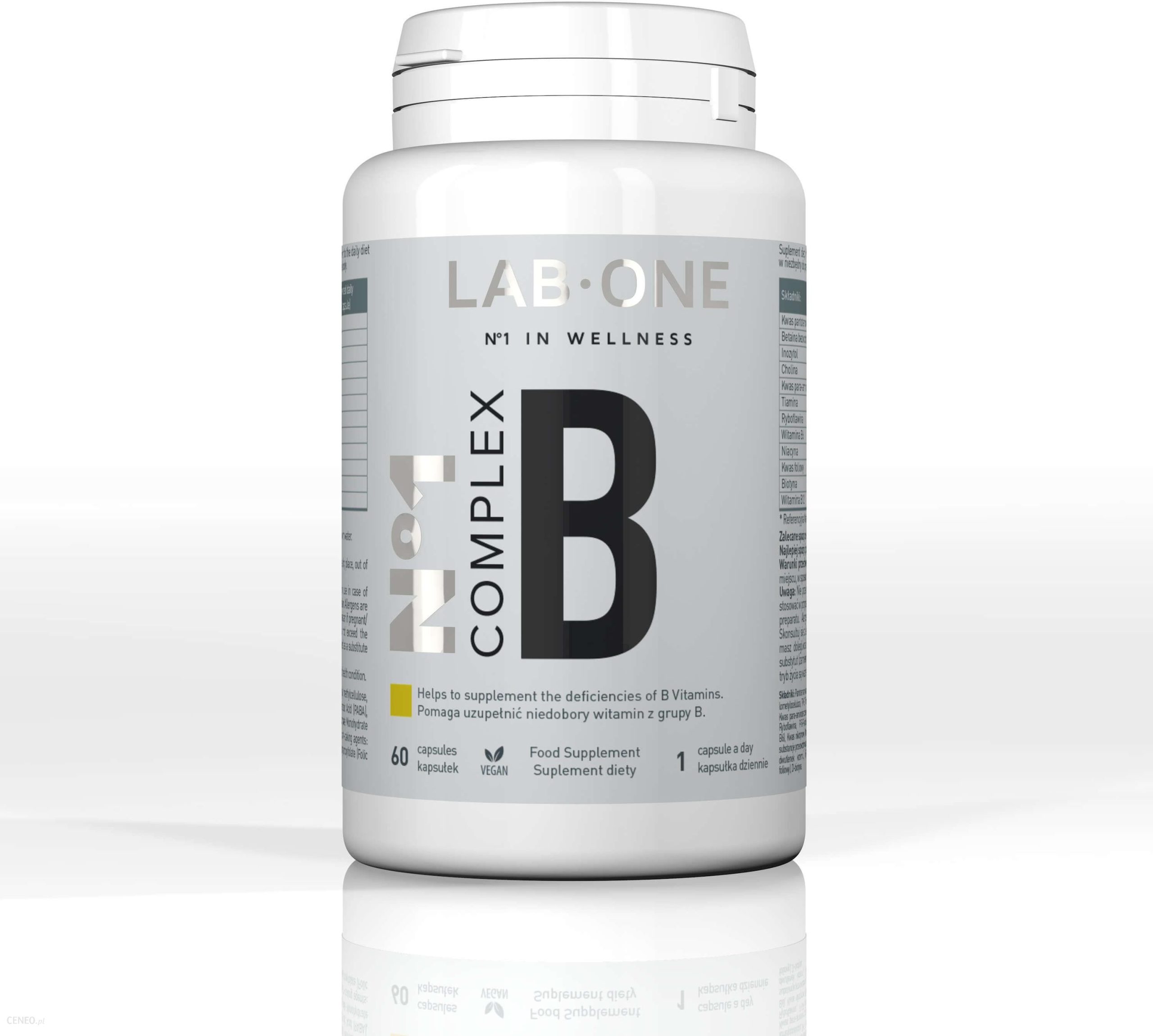 Lab One Vitamin B-Complex – 60kapsSuplement diety N°1 Complex B to kompleksowe uzupełnienie codziennej diety w niezbędny do prawidłowego funkcjonowania organizmu zestaw witamin z grupy B. Preparat został skomponowany tak, by pozytywnie wpływać na wiele podstawowych procesów życiowych. To prawdziwy biokatalizator złożony z substancji, które są najistotniejsze dla zachowania dobrego zdrowia.Kwas pantotenowyprzyczynia się do utrzymania prawidłowego metabolizmu energetycznego,pomaga w utrzymaniu sprawności umysłowej na prawidłowym poziomie,przyczynia się do zmniejszenia uczucia zmęczenia i znużenia,przyczynia się do prawidłowej syntezy i metabolizmu hormonów steroidowych, witaminy D i niektórych neuroprzekaźników.Betaina bezwodna przyczynia się do utrzymania prawidłowego metabolizmu homocysteiny.Cholinapomaga w prawidłowym funkcjonowaniu wątroby,przyczynia się do utrzymania prawidłowego metabolizmu homocysteiny,przyczynia się do utrzymania prawidłowego metabolizmu tłuszczów.Tiaminapomaga w prawidłowym funkcjonowaniu serca,przyczynia się do utrzymania prawidłowego metabolizmu energetycznego,pomaga w prawidłowym funkcjonowaniu układu nerwowego,pomaga w utrzymaniu prawidłowych funkcji psychologicznych,bierze udział w utrzymaniu prawidłowego rozwoju i funkcji układu nerwowego,bierze udział w prawidłowym metabolizmie węglowodanów i procesach pozyskiwania energii u dzieci. Ryboflawinapomaga w utrzymaniu prawidłowego widzenia,przyczynia się do utrzymania prawidłowego metabolizmu żelaza,pomaga zachować zdrową skórę,pomaga w utrzymaniu prawidłowego stanu błon śluzowych,pomaga w utrzymaniu prawidłowego stanu czerwonych krwinek,przyczynia się do zmniejszenia uczucia zmęczenia i znużenia,pomaga w ochronie komórek przed stresem oksydacyjnym,pomaga w prawidłowym funkcjonowaniu układu nerwowego,przyczynia się do utrzymania prawidłowego metabolizmu energetycznego.Witamina B6przyczynia się do utrzymania prawidłowego metabolizmu białka i glikogenu,pomaga w prawidłowym funkcjonowaniu układu nerwowego,pomaga w prawidłowej produkcji czerwonych krwinek,pomaga w prawidłowym funkcjonowaniu układu odpornościowego,przyczynia się do regulacji aktywności hormonalnej,pomaga w utrzymaniu prawidłowego metabolizmu homocysteiny,przyczynia się do utrzymania prawidłowego metabolizmu energetycznego,pomaga w utrzymaniu prawidłowych funkcji psychologicznych,przyczynia się zmniejszenia uczucia zmęczenia i znużenia,pomaga w prawidłowej syntezie cysteiny.Niacynaprzyczynia się do utrzymania prawidłowego metabolizmu energetycznego,pomaga w prawidłowym funkcjonowaniu układu nerwowego,pomaga zachować zdrową skórę,pomaga w utrzymaniu prawidłowego stanu błon śluzowych,przyczynia się do zmniejszenia uczucia zmęczenia i znużenia,pomaga w utrzymaniu prawidłowych funkcji psychologicznych.Kwas foliowypomagają w prawidłowej produkcji krwi,pomagają w utrzymaniu prawidłowego metabolizmu homocysteiny,pomagają w utrzymaniu prawidłowych funkcji psychologicznych,przyczyniają się do zmniejszenia uczucia zmęczenia i znużenia,pomagają w prawidłowym funkcjonowaniu układu odpornościowego,biorą udział w procesie podziału komórek,pomagają w prawidłowej syntezie aminokwasów,przyczyniają się do wzrostu tkanek matczynych w czasie ciąży,uzupełniające spożycie kwasu foliowego zwiększa poziom folianów u matki. Niski poziom folianów u matki jest czynnikiem ryzyka rozwoju wad cewy nerwowej u rozwijającego się płodu. Biotynaprzyczynia się do utrzymania prawidłowego metabolizmu makroskładników odżywczych,przyczynia się do utrzymania prawidłowego metabolizmu energetycznego,pomaga zachować zdrową skórę,pomaga w utrzymaniu prawidłowego stanu błon śluzowych,pomaga w prawidłowym funkcjonowaniu układu nerwowego,pomaga zachować zdrowe włosy,pomaga w utrzymaniu prawidłowych funkcji psychologicznych.Witamina B12pomaga w prawidłowej produkcji czerwonych krwinek,odgrywa rolę w procesie podziału komórek,pomaga w utrzymaniu prawidłowych funkcji psychologicznych,pomaga w prawidłowym funkcjonowaniu układu nerwowego,pomaga w utrzymaniu prawidłowego metabolizmu homocysteiny,przyczynia się do utrzymania prawidłowego metabolizmu energetycznego,pomaga w prawidłowym funkcjonowaniu układu odpornościowego,przyczynia się do zmniejszenia uczucia zmęczenia i znużenia.