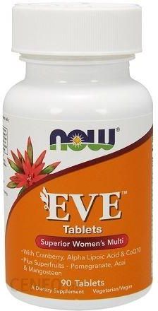 Now Foods EVE Superior Womens Multi 90 Softgels – Kompleks Witamin Stworzony dla Kobiet! Jeden z najlepszych kompleksów witaminowych stworzonych z myślą o kobietach Doskonałe uzupełnienie witamin i minerałów Doskonale wpływa na poprawę koncentracji Doskonała przyswajalność Niweluje skutki stresu Większa energia w ciągu całego dnia Poprawia witalność Zapobiega wypadaniu włosów Zwalcza występowanie wolnych rodników Dla kogo Now Foods EVE Superior Womens Multi 90 Softgels? Wyzwania otaczającego nas świata stawiają przed wieloma współczesnymi kobietami wysokie wymagania. Życie w wiecznym pędzie, stres, presja w miejscu pracy, brak snu, potrzeba wychowania dzieci to tylko cząstka życia kobiet, które jak nigdy wcześniej są narażone na ekstremalne ubytki niezbędnych witamin i minerałów z ich organizmu. Nawet dobrze zbilansowana dieta nie jest w stanie uzupełnić nam braków witaminowych powstających w ciągu całego dnia. Dlaczego tak się dzieje? Główny powód to nasze codzienne pokarmy, warzywa i owoce, które niestety są coraz bardziej ubogie w niezbędne witaminy i minerały. To właśnie z myślą o kobietach i ich wyjątkowych potrzebach powstał pełnowartościowy kompleks witaminowy Now Foods EVE Multi-VItamin for Woman. Now Foods EVE to zestaw witamin przeznaczony dla wszystkich dorosłych kobiet, które pragną utrzymać dobre zdrowie, sprawność psycho-fizyczną oraz zachować siły witalne na najwyższym poziomie. Jest to idealna propozycja dla kobiet aktywnych fizycznie narażonych na ubytki niezbędnych mikroelementów z ich organizmu. Now Foods EVE znajdzie zastosowanie zarówno wśród kobiet aktywnych zawodowo, jak i matek wychowujących swoje dzieci. Produkt jest szczególnie polecany kobietom uprawiającym różnego rodzaju sporty, jako skuteczny sposób na uzupełnienie mikroelementów i witamin utraconych w czasie wzmożonego wysiłku fizycznego. Co zyskam stosując Now Foods EVE Superior Womens Multi? Zestaw witaminowy Now Foods EVE to wysokiej jakości suplement diety o niespotykanej mieszance witamin stworzonej z myślą o współczesnej kobiecie i jej potrzebach. Regularne spożywanie suplementu ma wpływ na szybszą regenerację organizmu, doskonale wpływa na stan skóry, paznokci i włosów, a także skutecznie zapobiega procesom starzenia. W składzie kompleksu witamin Now Foods EVE znajdziemy: Witamina A znana jako Beta Karoten, odpowiedzialna za prawidłowe funkcjonowanie wzroku. Dodatkowo witamina A wzmacnia odporność całego organizmu, wspomaga procesy metaboliczne, a także posiada zbawienny wpływ na prawidłowe funkcjonowanie wątroby. Witamina C stosowana w medycynie i profilaktyce, głównie w celu budowania odporności organizmu. Mało kto jednak zdaj sobie sprawę z faktu że jest to również doskonały przeciwutleniacz, którego właściwości potrafią skutecznie hamować procesy starzenia, a także zatrzymują występowanie wolnych rodników. Witamina C to również niezbędny element w prawidłowym procesie przyswajania żelaza. Witamina D odpowiada za dobry stan kości i zębów, a także wpływa na prawidłową pracę całego układu nerwowego. Dodatkowo witamina D wspiera wchłanianie wapnia i fosforu, a także stabilizuje poziom cukru we krwi. Witamina E nazywana również „witaminą młodości” to bardzo silny przeciwutleniacz skutecznie usuwający wolne rodniki, a także mający ogromny wpływ na zatrzymanie procesów starzenia. Witamina E zapobiega też występowaniu zakrzepom, obniża poziom cholesterolu we krwi, a także ma zbawienny wpływ na metabolizm. Wg wielu naukowców, witamina E obniża ryzyko zachorowalności na nowotwory, a także zmniejsza ryzyko wystąpienia zawału serca czy udaru mózgu. Witamina K jest przede wszystkim odpowiedzialna za zachowanie odpowiedniej krzepliwości krwi w organizmie oraz wspomaga gojenie się ran. Jej regularne spożywanie przyczynia się do zmniejszenia intensywności i obfitości miesiączek. Tiamina (Witamina B1) wspiera prawidłowe funkcjonowanie układu nerwowego, a także wspiera prawidłowe działanie układu sercowo – naczyniowego. Tiamina posiada właściwości antyoksydacyjne, wspiera odporność całego organizmu, a także działa przeciwbólowo i znacząco przyspiesza gojenie się ran. Niacyna (Witamina B3 lub zwana też PP) posiada zbawienne właściwości dla organizmu, wspierając jego odporność. Niacyna wspomaga również pracę całego układu nerwowego, dzięki czemu niweluje niepożądane skutki stresu oraz ma wpływ na zwiększenie pewności siebie. Dodatkowo dowiedziono również i witamina B3 stabilizuje ilość cholesterolu we krwi, a także ma zbawienny wpływ na skórę, włosy i paznokcie. Witamina B6 (pirodoksyna) wspiera odporność organizmu, układ nerwowy, a także ma wpływ na prawidłową pracę serca, normalizuje ciśnienie krwi i skurcze mięśni. Kwas foliowy (Witamina B9) bierze bezpośredni udział w syntezie kwasów nukleinowych, z których później powstaje DNA, przez co reguluje funkcjonowanie komórek. Witamina ta wraz z witaminą B12 uczestniczy w procesie tworzenia i dojrzewania czerwonych krwinek, co sprawia że posiada działania krwiotwórcze. Wg wielu naukowców kwas foliowy zapobiega występowaniu nowotworów, w tym bardzo groźnego dla kobiet raka szyjki macicy. Witamina B12 to niezbędny składnik, który powinien znaleźć się w naszym codziennym witaminowym menu. Jej właściwości regulują układ nerwowy, znacząco podnosząc naszą odporność na stres oraz zapobiegając stanom lękowym. Ponadto witamina B12 zapobiega anemii, a także poprawia apetyt. Wielu naukowców twierdzi, iż witamina B12 pomaga uniknąć zachorowania na nowotwór, Alzheimera, a także zapobiega występowaniu chorób psychicznych. W połączeniu z witaminą B6 oraz kwasem foliowym skutecznie zapobiega chorobom układu krążenia. Biotyna (Witamina B7) odpowiada za prawidłową przemianę materii, zwłaszcza podczas pr