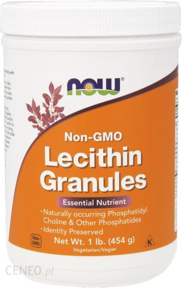 Poprawia pamięć i funkcje poznawczeZwiększa zdolności intelektualnePrzyspiesza proces uczenia sięUłatwia koncentracjęProfilaktyka miażdżycyReguluje profil lipidowyObniża poziom trójglicerydówChroni wątrobęNOW Non-GmoLecithin Granules towysoka dawka lecytyny słonecznikowej bez GMO w wygodnych w użyciu kapsułkach. Bogata w substancje bioaktywne lecytyna stanowi źródło niezbędnych kwasów tłuszczowych i choliny, usprawnia funkcjonowanie układu nerwowego, mózgu i wątroby oraz pomaga utrzymać prawidłowy metabolizm tłuszczów. Szczególnie polecamy ją osobom pracującym umysłowo – poprawia pamięć i koncentrację. Lecytyna pomaga w emulgowaniu tłuszczów, umożliwiając ich rozproszenie w wodzie. Lecytyna jest naturalnie występującym związkiem który znajduje się we wszystkich komórkach w przyrodzie, roślin i zwierząt.Dawkowanie:1 i ½ łyżeczki dziennie, najlepiej z posiłkiem. Rozpuścić w soku, dodać do szejka albo posypać potrawę.Składniki:Wielkość opakowania: 454 gPorcja dzienna: 1 1/2 łyżeczki stołowej (10 g)Ilość porcji w opakowaniu: 45W porcji dziennej (10 g)Zawartość%ZDSKalorie 70Kalorie z tłuszczu 50Całkowita zawartość tłuszczu 5 g 8%Tłuszcznasycony 1,5 g 8%Tłuszczetrans 0 g *Tłuszczwielonasycony 3,5 g *Cholesterol0 mg 0%Sód0 mg 0%Potas160mg 5%Węglowodany1 g Błonnik0g 0%Cukry0g *Białko0g *Witamina A0% *Wapń2% *Fosfor30% *Non-GMOSoy Lecithin10 g (10,000 mg) *