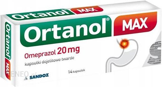 Wskazania: leczenie objawów refluksu żołądkowo – przełykowego (np. zgaga, zarzucanie treści żołądkowej) u dorosłych.Skład: 1 kapsułka Ortanol Max zawiera 20mg omeprazolu oraz substancje pomocnicze: Granulki: hydroksypropyloceluloza o niskim stopniu podstawienia, celuloza mikrokrystaliczna, laktoza bezwodna, powidon, polisorbat 80, magnezu tlenek, talk, kwasu metakrylowego kopolimer, dyspersja typu C, 30% wodna dyspersja (d.s. 38,700 mg), trietylu cytrynian, magnezu stearynian.Otoczka: żelatyna, tytanu dwutlenek (E171).Tusz: szelak, glikol propylenowy, amonowy wodorotlenek, żelaza tlenek czarny (E172) lub szelak, żelaza tlenek czarny (E172), glikol propylenowy, stężony roztwór amoniaku, potasu wodorotlenek.Działanie: inhibitor pompy protonowej w komórkach okładzinowych żołądka. Hamuje wydzielanie kwasu solnego.Dawkowanie: należy przyjmować jedną kapsułkę 20mg raz na dobę przez 14dni.Przeciwwskazania: nadwrażliwość na składniki preparatu. Pacjenci z zaburzeniami czynności wątroby leczeni klarytromycyną. Pacjenci leczeni atazanawirem lub nelfinawir. Należy zachować ostrożność podczas terapii skojarzonej, szczególnie u pacjentów z zaburzeniami czynności wątroby i nerek. Nie stosować u pacjentów z występującą dziedziczną nietolerancją galaktozy, niedoborem laktazy (typu Lapp) lub zespołem złego wchłaniania glukozy-galaktozy.