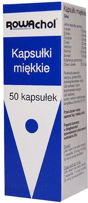RowacholRowachol na kamicę żółciową 50kapsRowachol stosowany jest w leczeniu i profilaktyce dolegliwości wątrobowo-żółciowych spowodowanych kamicą żółciową. Stany skurczowe i dyskineza dróg żółciowych. Pomocniczo przed i po zabiegach chirurgicznych na drogach żółciowych.Skład:1 kaps. elastyczna zawiera: 13,6 mg α-pinenu, 3,4 mg β-pinenu, 32 mg mentolu, 6 mg mentonu, 5 mg kamfenu, 5 mg borneolu, 2 mg cyneolu. 100 mg kropli zawiera: 13,6 mg α-pinenu, 3,4 mg β-pinenu, 32 mg mentolu, 6 mg mentonu, 5 mg kamfenu, 5 mg borneolu, 2 mg cyneolu.Działanie:Preparat o działaniu żółciopędnym i rozkurczowym. Zmniejsza zastój żółci i poprawia funkcje metaboliczne wątroby. Działa rozkurczająco w stanach skurczowych dróg żółciowych i zmniejsza dolegliwości bólowe. Systematycznie przyjmowany ułatwia rozpuszczenie istniejących cholesterolowych kamieni żółciowych i zapobiega powstawaniu nowych (hamuje aktywność HMGCoA-reduktazy). Preparat szybko wchłania się z przewodu pokarmowego. Jest metabolizowany w wątrobie i wydalany w postaci glukuronianów z moczem i żółcią.Wskazania:Leczenie i profilaktyka dolegliwości wątrobowo-żółciowych spowodowanych kamicą żółciową. Stany skurczowe i dyskineza dróg żółciowych. Pomocniczo przed i po zabiegach chirurgicznych na drogach żółciowych.Przeciwwskazania:Nadwrażliwość na składniki preparatu. I trymestr ciąży i okres karmienia piersią. Nie stosować u dzieci do ukończenia 6 r.ż. oraz u pacjentów z kolką żółciową, ostrymi stanami zapalnymi dróg żółciowych i z uszkodzeniem wątroby.Dawkowanie:Doustnie. Kaps. Dorośli: 1 kaps.3-4 razy dziennie. Dzieci od 7-14 r.ż: 1 kaps. 1-2 razy dziennie.Krople. Dorośli: 3-5 kropli 4-5 razy dziennie. W przypadku kolki 20-30 kropli, w razie konieczności po 20 min dawkę można powtórzyć.Dzieci od 7-14 r.ż: 1- 2 krople 3-4 razy dziennie. Kapsułki i krople należy przyjmować 30 min przed posiłkiem (zapobiega to wystąpieniu odbijania i uczucia miętowego smaku po jedzeniu).