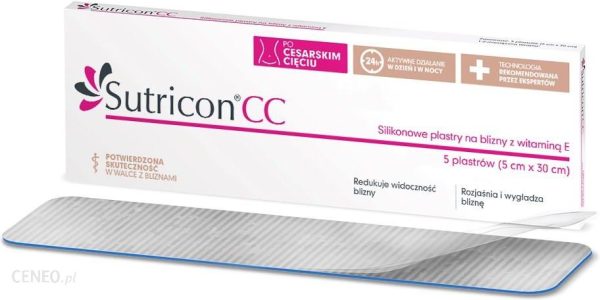 Dodatkowe informacjeSkładniki:Żel silikonowy z witaminą E, elastyczna membrana poliuretanowa Zawartość opakowania: 5 plastrów silikonowych o rozmiarze 5 cm x 30 cm do indywidualnego dopasowania (przycięcia) do powierzchni blizny. Rozmiar dostosowany do blizn po cesarskim cięciu. Czas terapii: Efekty można zaobserwować już po miesiącu, jednak pełna kuracja jest dłuższa i zależy od wielu czynników indywidualnych. Aby osiągnąć zadowalające efekty, należy stosować preparat regularnie i postępować zgodnie z instrukcją używania. Długość terapii to średnio: min. 3 miesiące w przypadku blizn świeżych oraz min. 6 miesięcy w przypadku blizn starszych. Przy skłonnościach do nieprawidłowego bliznowacenia, np. keloidów czy bliznowców zaleca się stosowanie plastrów Sutricon CC przez cały okres przebudowy blizny, nawet do 12 miesięcy.