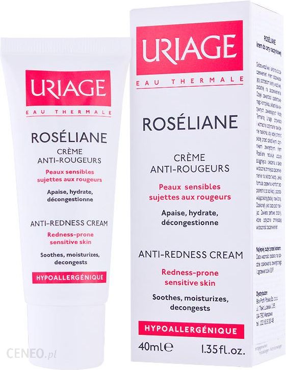 CHARAKTERYSTYKAUriage Roseliane stworzony do pielęgnacji skóry z rozszerzonymi naczynkami. Długotrwale neutralizuje zaczerwienienia. Wzmacnia kruche naczynka i zapobiega ich pękaniu. Łagodzi obrzęk, uczucie gorąca i ściągnięcia skóry. Innowacyjny kompleks Cerasterol-2F koi i rekonstruuje skórę, chroniąc ją przed wpływem agresywnych czynników zewnętrznych mogących wywoływać rumień. WSKAZANIASkóra naczynkowa, reaktywna, wrażliwaSKŁADWoda Termalna Uriage, SK5R COMPLEX, TLR2-REGUL COMPLEX, CERASTEROL-2F ekstrakt z żeń-szenia, EKSTRAKT Z CZERWONYCH I BRUNATNYCH ALGSPOSÓB UŻYCIARano i wieczorem.