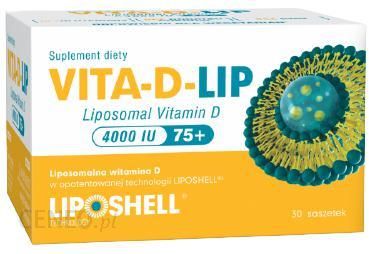 Właściwości VITA-D-LIP Liposomal Vitamin D 4000 IU 75+:opatentowana technologia LIPOSHELL®wysokiej jakości liposomybardzo dobre wchłanianie witaminy Dułatwione dotarcie witaminy D do tkanekprodukt bezglutenowy, bez dodatku cukrów, odpowiedni dla wegetarianVITA-D-LIP® liposomalna witamina D 4000 IU – to produkt liposomalny w opatentowanej technologii LIPOSHELL®, wytwarzany zgodnie z wysokimi standardami jakościowymi w oparciu o innowacyjne procesy produkcyjne, nadające mu cechy unikalne na skalę światową.Kluczowym elementem technologii LIPOSHELL® są precyzyjnie zaprojektowane liposomy, efekt wieloletnich prac multidyscyplinarnego zespołu naukowców. W przeciwieństwie do klasycznych form preparatów, takich jak: tabletki, kapsułki, maści, kremy lub krople, liposomy LIPOSHELL®:zapewniają długotrwałe utrzymanie stałego poziomu substancji aktywnej w obszarze docelowym.chronią substancję aktywną przed czynnikami, które mogą niekorzystnie na nią wpłynąć np. wilgoć, temperatura, enzymy trawienne, czy sok żołądkowy;zapewniają substancji aktywnej długotrwałą ochronę i stabilnośćZalecane spożycie:VITA-D-LIP 4000 IU przeznaczony jest wyłącznie dla osób zdrowych powyżej 75. roku życia, w zwiększonym zapotrzebowaniu na witaminę D. Porcja produktu zalecana do spożycia w ciągu dnia: 1 saszetka 1 raz dziennie.